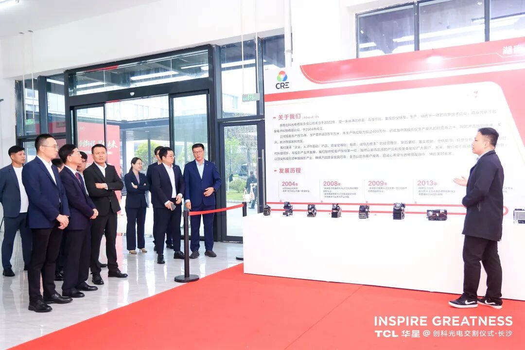 TCL华星高级副总裁兼湖南创科光电有限责任公司董事长王修艺,TCL华星副总裁、财务中心中心长兼湖南创科光电有限责任公司董事习文波,TCL华星专显事业部总经理兼湖南创科光电有限责任公司董事刘广辉,TCL华星人力资源中心长李竹子,TCL华星武汉基地总经理陈晖,TCL华星运营中心经规经管总监陈辉,湖南创科光电责任有限公司董事、总经理任乐军,湖南创科光电责任有限公司董事、研发中心副负责人杨秀才,TCL华星专显事业部产品开发处总监兼湖南创科光电有限责任公司副总经理张恒,望城经开区党工委副书记、管委会主任周剀,望城经开区管委会副主任张芬等共同出席了本次仪式,见证了这一里程碑时刻。
