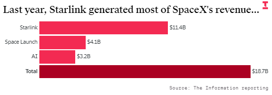 数据显示,SpaceX 的星链互联网连接业务去年营收达 114 亿美元,同比增长 50%,占公司总销售额的 61%。该业务线也是公司唯一实现现金盈利的板块。