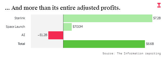星链业务产生的现金,实际上远不足以覆盖其他业务的消耗。数据显示,星链的自由现金流(调整后 EBITDA 减去资本支出)约为 30 亿美元。相比之下,火箭发射业务的自由现金流为负约 30 亿美元,而 AI 业务的现金消耗高达近 140 亿美元。